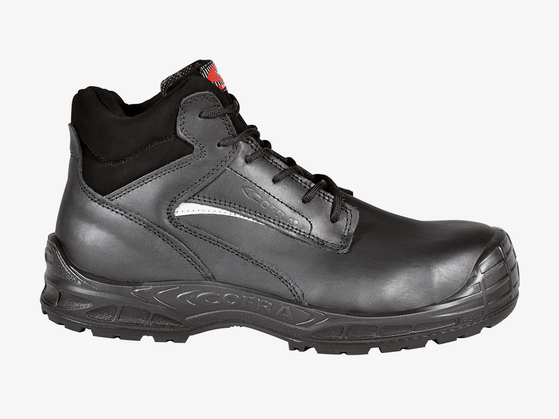 Een metaalvrije veiligheidsschoen met kou-isolatie, S3 en antislip op alle ondergronden, voorzien van metaalvrije top return neus en metaalvrij antipenetratiezool.