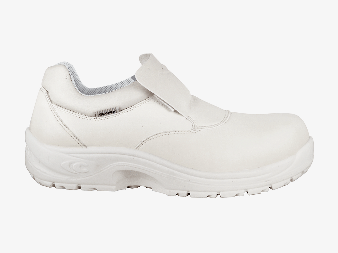 Een witte instapper veiligheidsschoen gemaakt van wasbaar en hygienisch ecolorica. S2 en antislip op alle ondergronden, voorzien van composiet neus en geen zoolbescherming, chemicaliën resistant.