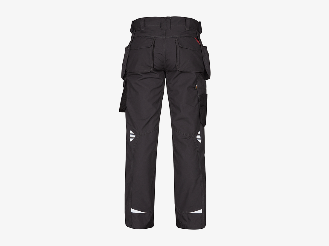 Functionele werkbroek met veel praktische details. Optimale pasvorm met o.a. ergonomisch gevormde kniepartij en een paneel in de binnennaden dat voor een comfortabele kruisnaad zorgt. Twee ruime, schuine zakken en twee holsterzakken aan de voorzijde. Lus met D-ring aan de voorzijde voor bevestigen van een id-kaart. Twee ruime achterzakken met klep en klittenbandsluiting. Dijbeenzak met ritszakje voor bv. een gsm plus een kleine, extra zak. De dijbeenzak is een cargozak met extra ruimte en een los hangende bodem voor extra bewegingsvrijheid. Duimstokzak met extra compartimenten en versterkte bodem. Ook de duimstokzak heeft een los hangende bodem voor extra bewegingsvrijheid. Knieversterkingen/kniezakken met klittenbandsluiting onderin en twee instelmogelijkheden voor kniebeschermers. Versterkingen aan de onderzijde van de pijpen zowel aan voor- als achterzijde, voor extra slijtvastheid. Reflectiestroken bij de knieën en onderaan de pijpen voor verbeterde zichtbaarheid. Geschikt voor industrieel wassen.