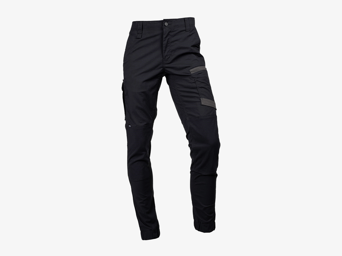 De broek is voorzien van een Active Fit tailleband met geïntegreerde stretch, wat zorgt voor meer bewegingsvrijheid, een betere pasvorm en langdurig comfort – ideaal voor dynamische werkomgevingen. De slanke en taps toelopende pasvorm, gecombineerd met een elastische enkelboord, zorgt voor een moderne, sportieve look met een functionele twist.