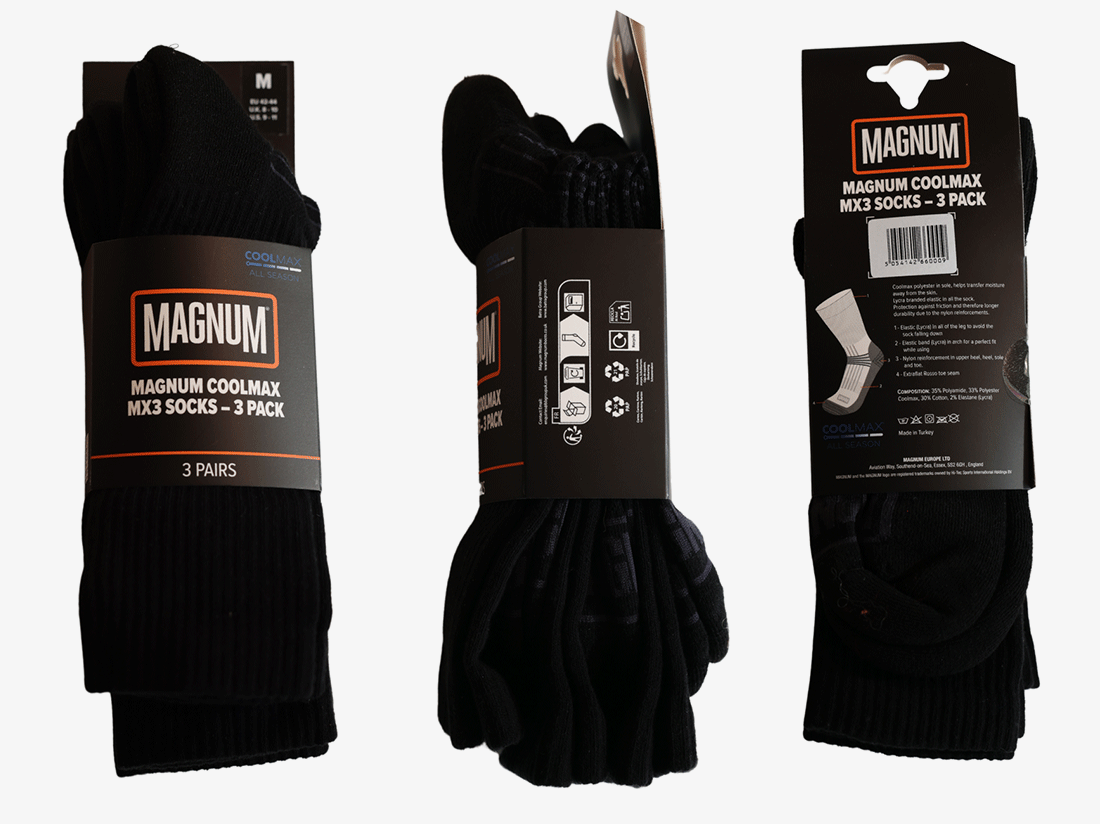 De MX-3 Heavyweight sok van Magnum met coolmax. Mooie stevige sok om in je Magnum schoenen te dragen in de zomermaanden. Met coolmax Elastieken band (Lycra) band bovenin de sok om afzakken te voorkomen. Elastieken band (Lycra) onder de voetholte voor een perfecte pasvorm. Extra nylon verstevingen op hak, tenen en onderkant. Platte zoom bij de tenen