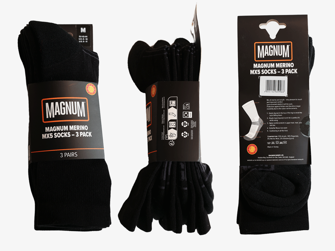 MX-5 Magnum Zwaargewicht Sokken Met Merino Wol Samenstelling: 52% Acryl, 25% Nylon, 22% Merino Wol, 1% Elasthaan (Lycra) Magnum logo Contrastkleurig detail op teen