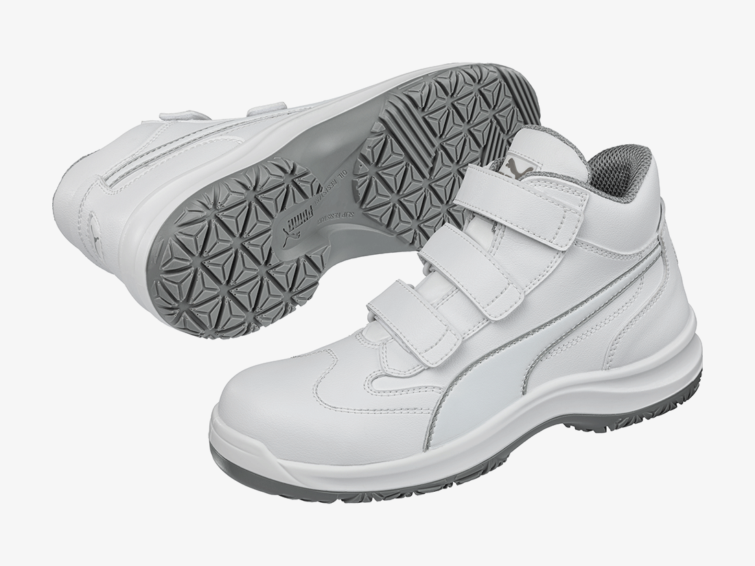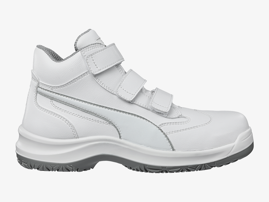 Het bijzondere aan de WHITE ‘N SERVICE serie van PUMA is IQ.CELL - een in de hiel geïntegreerd gelkussen, dat als trampoline werkt. Het dempt schokken, vangt energie op en geeft deze direct daarna terug als springkracht. De ABSOLUTE MID, een witte werkschoen met handige klittenbandsluiting, is perfect geschikt voor gebruik in keukens, laboratoria en andere werkomgevingen met vloertegels. Want dankzij de speciale structuur van het antislipprofiel op de slijtvaste, flexibele en lichte loopzool wordt stilstaand vocht afgevoerd en de antislipwerking nog beter.