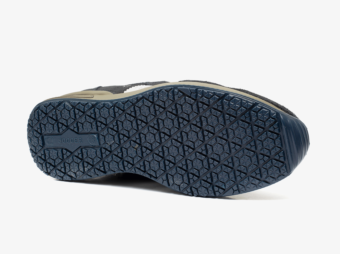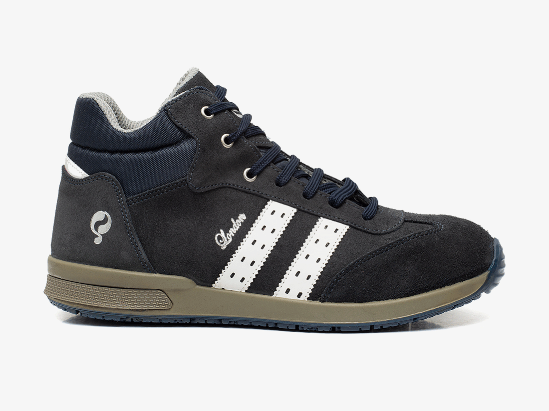 Sportieve donker blauwe halfhoge sneaker uit suède. S3S en antislip op alle ondergronden, voorzien van stalen neus en flexibele kevlar zool.