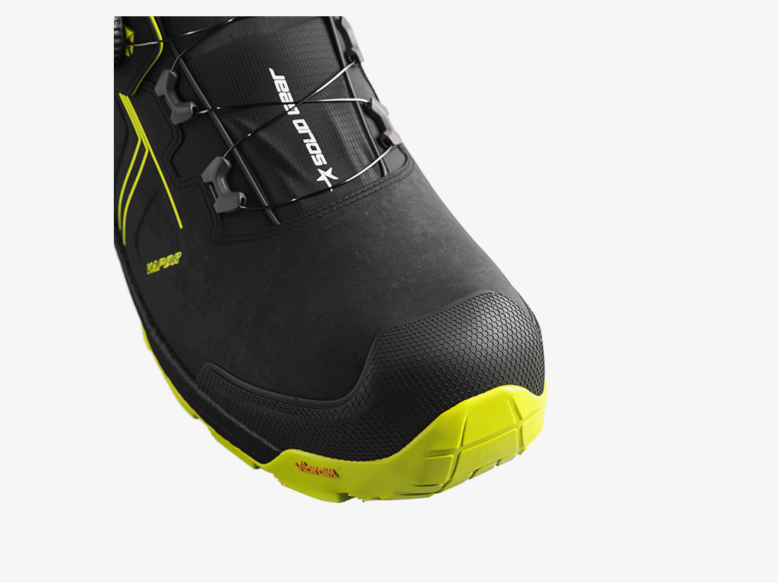 De zoolconstructie is ontwikkeld voor lange werkdagen: de Vibram® buitenzool met Traction Lugs geeft je stevige grip op elke ondergrond, terwijl de ETPU tussenzool en de OrthoLite® Hybrid™ binnenzool zorgen voor optimale demping, energie-teruggave en minder vermoeide voeten. De glasvezel neus biedt dezelfde bescherming als staal, maar is veel lichter, en de ESD-certificering maakt de Vapor 3 geschikt voor elektrostatisch gevoelige werkplekken.
